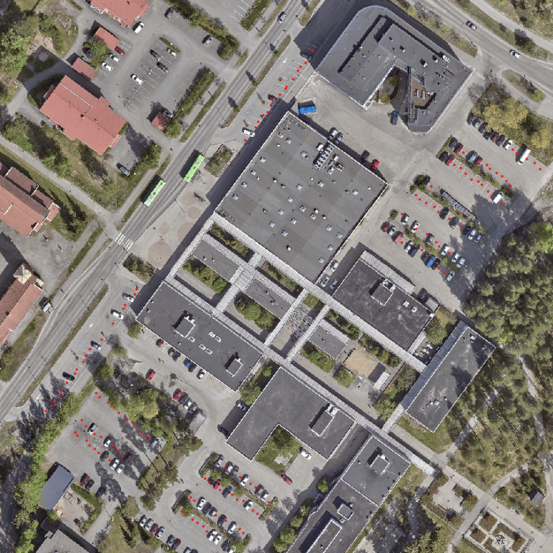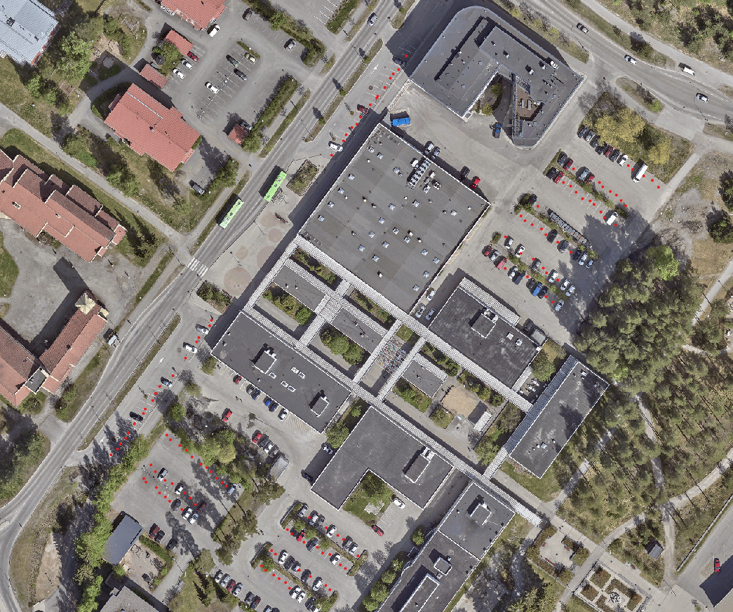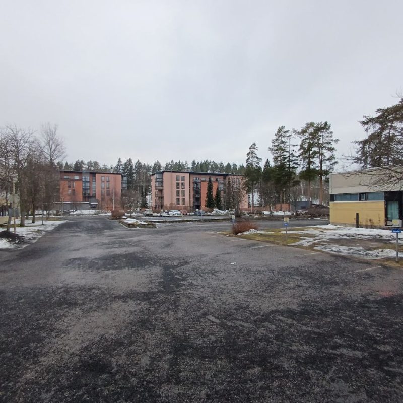 Ilmakuvista näkyy, miten alueen tonttien pinta-alasta on varattu pysäköintiin isoja alueita, mutta tyhjistä paikoista näkee ettei jatkuvaa tarvetta ole yhteensä näin suurelle määrälle. Keskitetty pysäköintiratkaisu tuottaisi siis tälläkin alueella viihtyisämpiä kortteleita.