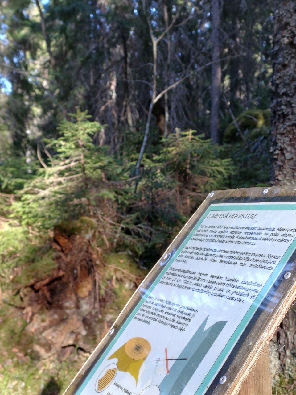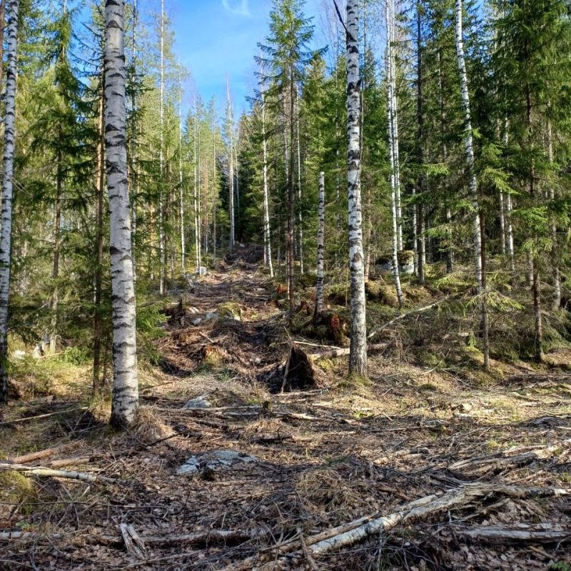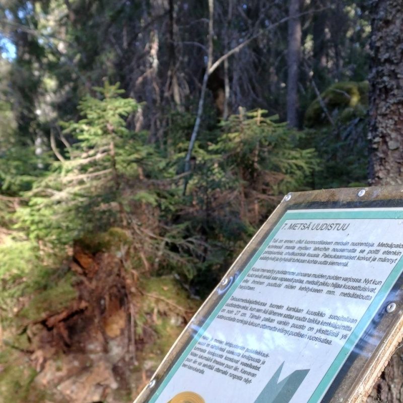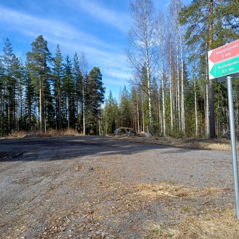 Tuleva ampumahiihtopaikan varaus latujen risteyksessä.Metsätöiden jälkiä pohjoisrinteen alapäässä.Tämän kuusikon ikä lähenee 100 vuotta, joten jos sitä ei suojeltaisi, se menisi ”uudistukseen” eli kaadettaisiin.Luontopolku kiertelee suojeltavalla alueella.Kuusikon reunalla näkyy ihmisten käden (ja koneiden) jälki.Uusi tieyhteys huipulle rakennettaisiin lähtemään tästä Vuorilammen parkkipaikan ja sillan välistä.