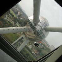 Sunnuntaina katsoin F1-kisan, joka, yllätys yllätys, paljastui tylsäksi. Seikkailoiduimme tram/metro-yhdistelmällä Heyseliin, jossa kiipesimme Atomiumiin. Pallot olivat isompia kuin odotimme, mutta maailmannäyttelyn 50-vuotisjuhlanäyttely oli ihan hauska. Atomiumin ylimmästä pallosta oli hyvät näköalat kaupunkiin, ja onnistuinpa kaatamaan myös yhden tietokoneen koskemalla siihen… Tyypillistä.