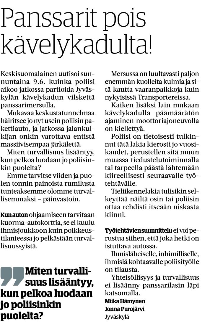 Keskisuomalainen uutisoi 9.6. kuinka poliisi aikoo jatkossa partioida Jyväskylän kävelykadun vilskettä panssarimersulla. Mukavaa keskustatunnelmaa häiritsee jo nyt usein poliisin pakettiauto, ja jatkossa jalankulkijan onkin varottava entistä massiivisempaa järkälettä. Miten turvallisuus lisääntyy, kun pelkoa luodaan jo poliisinkin puolelta?