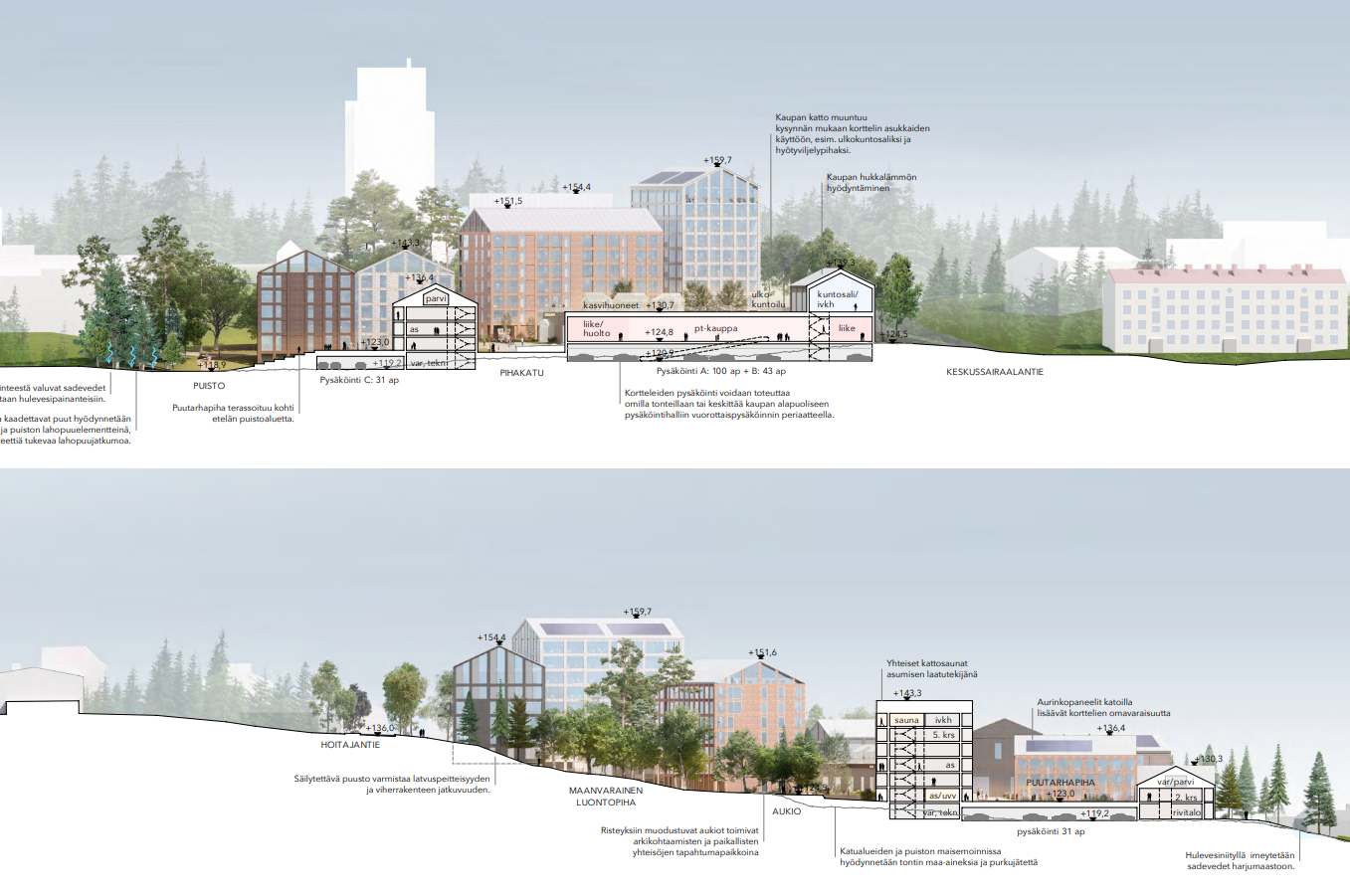 Miksei puustoa suojella tiukemmin myös arkkitehtuurikilpailun voittajateoksen perusteella luodussa kaavassa, kun siinä oli mainittuna eksplisiittisesti tiettyjä säilytettäviä puustoisia alueita? Mihinkähän suuntaan tässä nyt ohjataan rakentajia? Nyt on riskinä, että on valittu toteutettavaksi hienosti luonnonarvojen säilyttämisellä markkinoitu suunnitelma, mutta ensimmäisenä kaadetaan kaikki puut, tasataan alueet ja rakentamisen jälkeen istutetaan muutama risu tilalle… [Viittoilee ylöspäin resurssiviisausohjelman suuntaan]