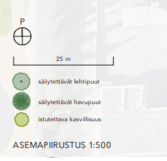 Treis-kilpailuaineistossa säilytettävä puusto oli nostettu erikseen karttakuvaan.
