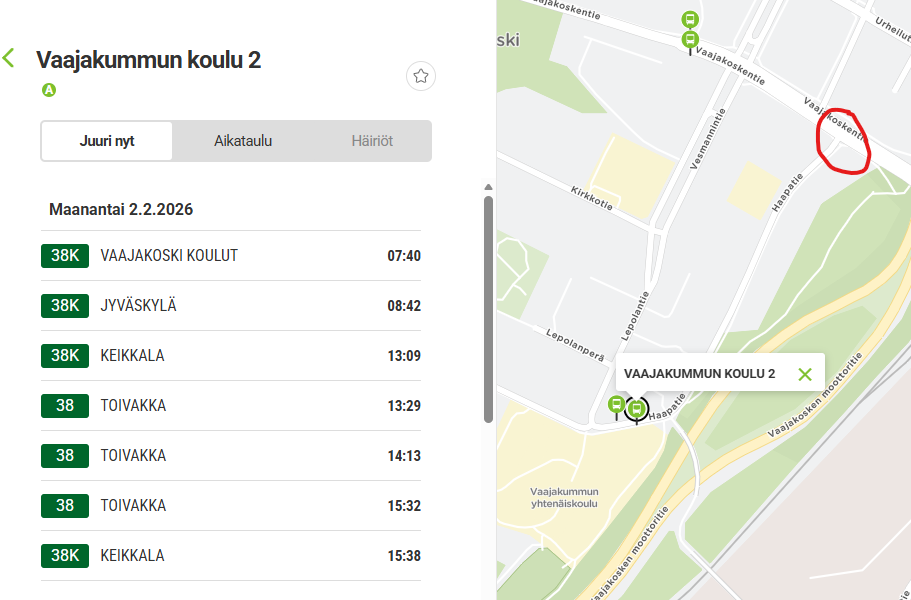 Jäin miettimään, mikä linja ajaa Haapatielle estäen risteysgeometrian muutokset – näköjään 38 kulkee muutaman kerran päivässä Toivakan suuntaan / suunnasta.